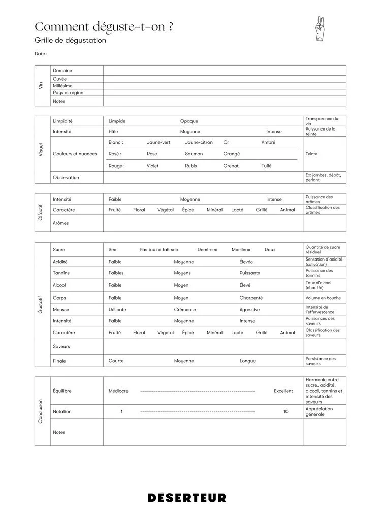 Pour vous aider à vous retrouver dans le vocabulaire lié au vin, on partage notre grille de dégustation avec vous. Pas de panique, on vous expliquera chacune de ces étapes.